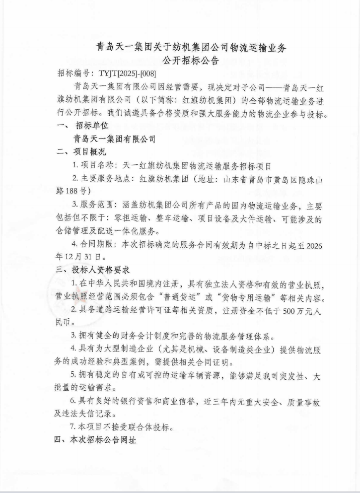 青島天一集團(tuán)關(guān)于紡機(jī)集團(tuán)公司物流運(yùn)輸業(yè)務(wù)公開招標(biāo)公告
